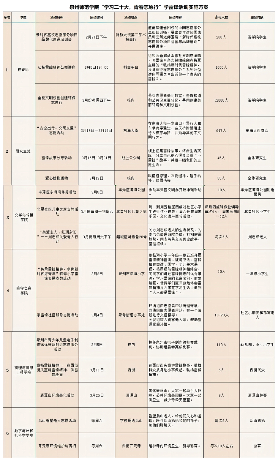 今年3月5日是全国第60个“学雷锋纪念日”。近期,习近平总书记对深入召开学雷锋活动作出重要指示。为深入贯彻落实党的二十大精神,学习贯彻习近平总书记重要指示精神,进一步落实省委部署实施的“深学争优、敢为争先、实干争效”行动,传承和弘扬雷锋精神,展现新时代泉师青年责任与担当,校团委决定召开“学习二十大,青春志愿行”学雷锋主题教育,号召各二级学院团委广泛召开新时代文明实践和志愿服务活动,具体实施方案如下。