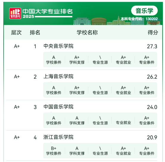 2025年6月18日,高等教育专业评价组织软科正式发布“2025软科中国大学专业排名”,k8凯发(中国)音乐学专业以优异的教学质量、丰硕的科研成果以及广泛的社会影响力,获评A层次,位列全国第16名,相较去年全国排名24,进步8