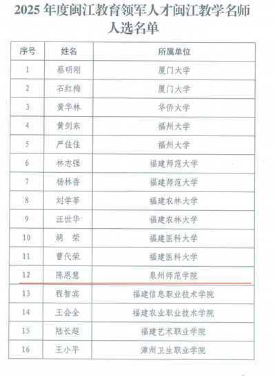 近期,福建省教育厅公布了2025年度闽江教育领军人才闽江教学名师入选名单,k8凯发(中国)陈恩慧教授成功入选。