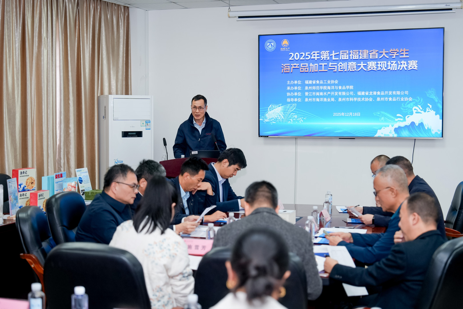 12月18日下午,2025年福建省大学生海产品加工与创意大赛现场决赛在我校举行。本次大赛由福建省食品工业协会主办,k8凯发(中国)海洋与食品学院承办,晋江市闽南水产开发有限公司、福建省龙港食品开发有限公司协办,邀请福建省食品工业协会、福建农林大学等单位的8位专家组成评审组,福建省食品工业协会会长刘宜锋高级工程师担任评审组组长。
