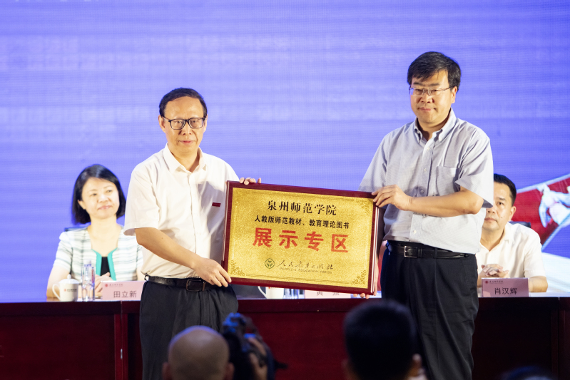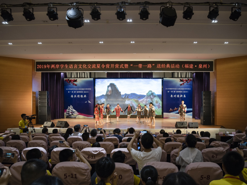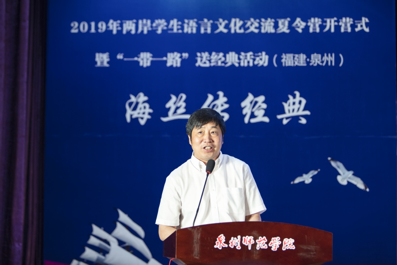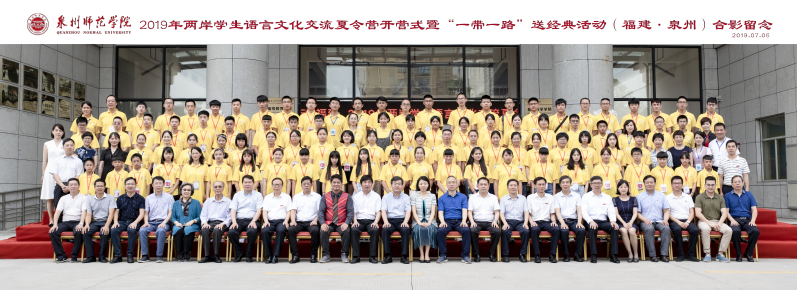 On the morning of July 6th, the Opening Ceremony of 2019 Language & Culture Communication Summer Camp for Students on Both Sides of the Taiwan Straits and “The Belt and Road” Chinese Classics Donation Ceremony were held in No.1 Academic Hall of Special Education Block in Quanzhou Normal University. More than 300 people attended the activity, including Tian Lixin, Director of Department of Language Application & Administration and Department of Language Information Management of the Ministry of Education, Li Xun, Deputy Director of Education Department of Fujian Province, Xiao Hanhui, Vice-Mayor of Quanzhou Municipal Government, Huang Qiang, Party Secretary and Director of People's Education Press, Fang Ming, General Counsel of Chinese Classics Database, Broadcasting Instructor of China Media Group and a famous recital artist, Zhu Shize, Party Secretary of QNU, Qu Guangqing, President of QNU, officials from Department of Language Application & Administration and Department of Language Information Management, Work Committee for Taiwan and Overseas Chinese of the Standing Committee of Fujian Provincial People's Congress, Education Department of Fujian Province, People's Education Press, Quanzhou Municipal Government, Straits Publishing & Distributing Group of Fujian Province, Quanzhou Education Bureau, heads of the relevant functional departments of QNU, and teachers and students of the summer camp. The opening ceremony was hosted by Huang Jiangkun, Vice President of QNU.