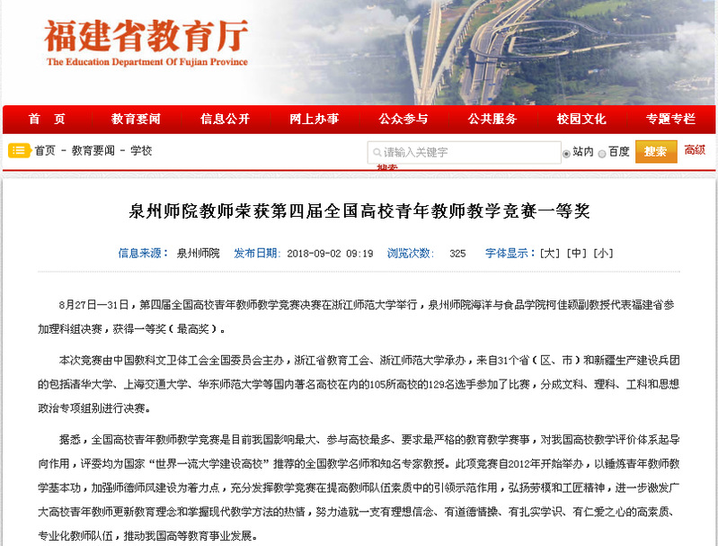 8月27日—31日,第四届全国高校青年教师教学竞赛决赛在浙江师范大学举行,泉州师院海洋与食品学院柯佳颖副教授代表福建省参加理科组决赛,取得一等奖(最高奖)。