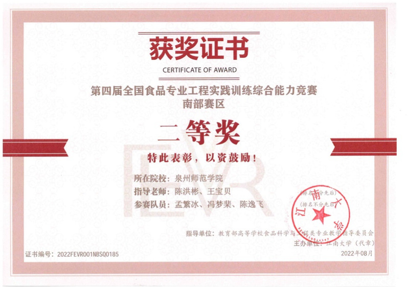 近期,第四届全国食品专业工程实践训练综合能力竞赛落下帷幕。我院陈洪彬和王宝贝博士指导的参赛团队(2020级食品科学与工程专业学生孟繁冰、冯梦棐和陈逸飞)顺利获得精心作答、细心操作,充分发挥团队协作精神,经过理论赛项、食品工程类仿真操作与食品工程原理设备实验(“远程智慧实操设备”线上操作)三轮激烈地角逐,荣获南部赛区团体二等奖。