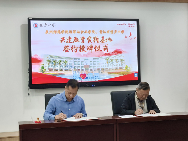 11月18日,海洋与食品学院与晋江市侨声中学共建教育实践基地签约授牌仪式在晋江市侨声中学举行。仪式由侨声中学教务处主任周明阳主持。参加仪式的有海洋与食品学院院长袁建军、党委书记蔡志荣、党政办公室主任洪钦赐,生物科学系主任陈细香、副主任王艺璇,侨声中学党委书记兼校长吴健康、教务处主任周明阳、副主任张劲松、蔡阿园、俞建明、主任助理陈秀盆以及生物组教师。