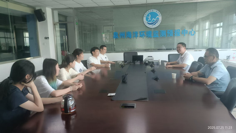 随后,一行人抵达泉州市海洋环境监测预报中心。在中心会议室,实习生们汇报了参与海洋生物标本分析采集、海水取样监测等核心工作的进展与收获。中心领导与学院一行围绕学生实习内容的深度、技术岗位安排及未来合作方向等方面交换了意见。监测站站长刘保清对我院实习生的专业素养和严谨态度给予了充分肯定,并表达了与学院进一步深化合作、共同培育海洋领域人才的强烈意愿。蔡志荣着重强调了实习期间的安全纪律要求,他期望实习生们在确保安全高效完成岗位工作的同时,不忘学业精进,做到实践与学习相互促进、相得益彰。