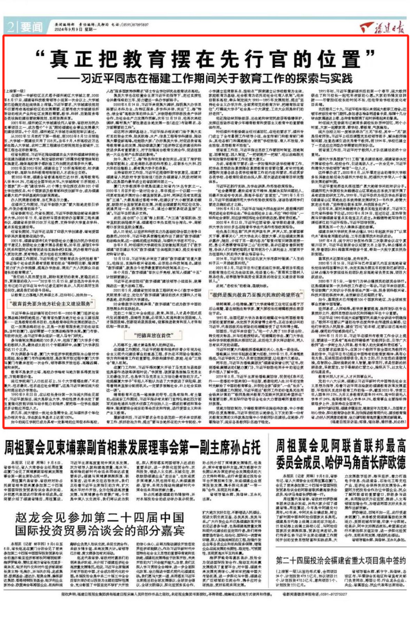 福建是习近平新时代中国特色社会主义思想的重要孕育地和实践地。近年来,福建日报社持续担当作为,带着感情、带着责任,深挖阐释理论富矿,推出“习近平同志在福建工作期间的探索与实践”系列报道。今天,《福建日报》一版和二版刊发《“真正把教育摆在先行官的位置”——习近平同志在福建工作期间关于教育工作的探索与实践》,全文如下,一起学习: