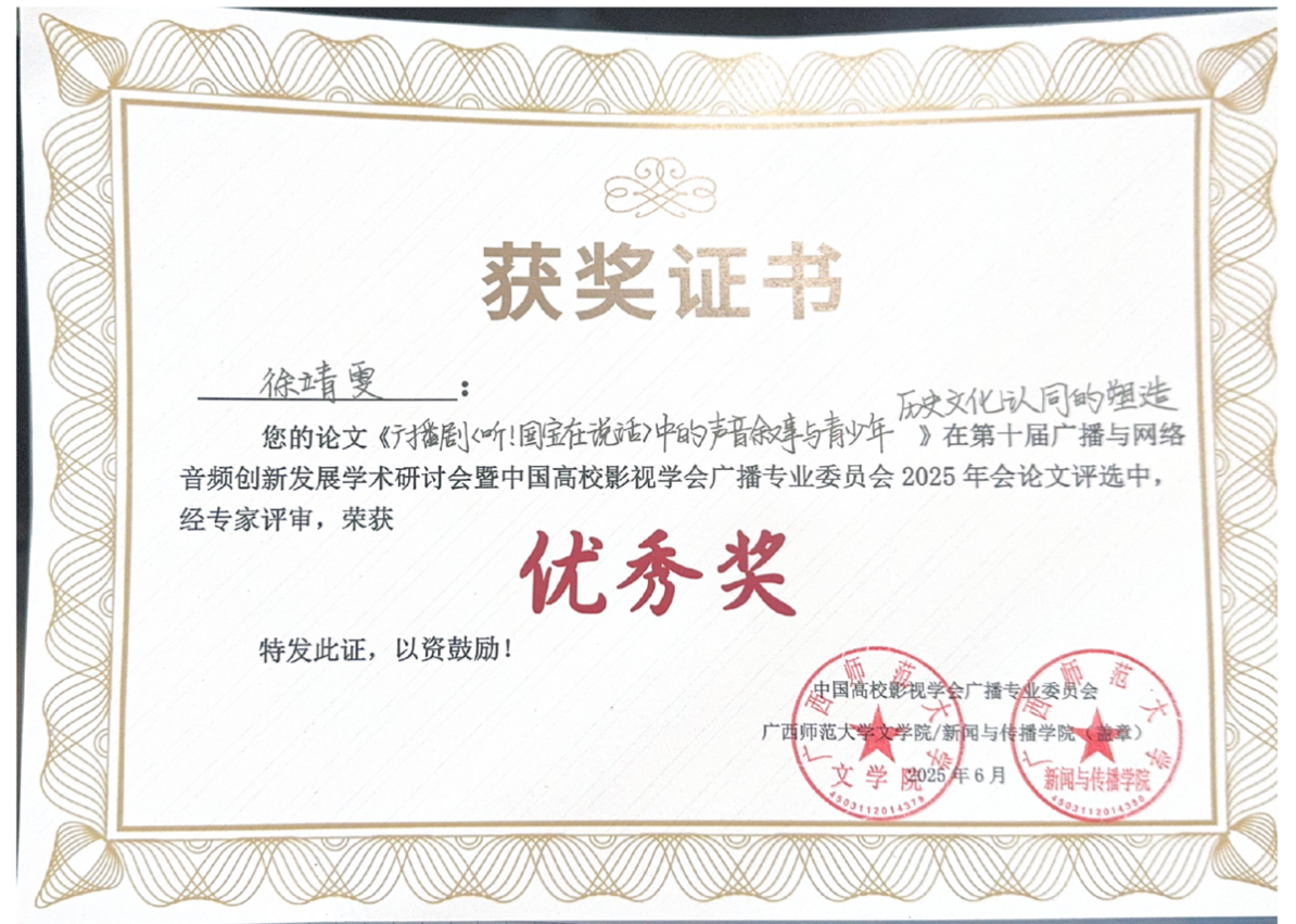 6月20日至22日,中国高校影视学会广播与网络音频专业委员会2025年年会暨第十届广播与网络音频创新开展学术研讨会在广西桂林举行。我院2023级广播电视艺术硕士研究生徐靖雯提交的论文《广播剧〈听!国宝在说话〉的声音叙事与青少年历史文化认同的塑造》入围会议并获得优秀奖。
